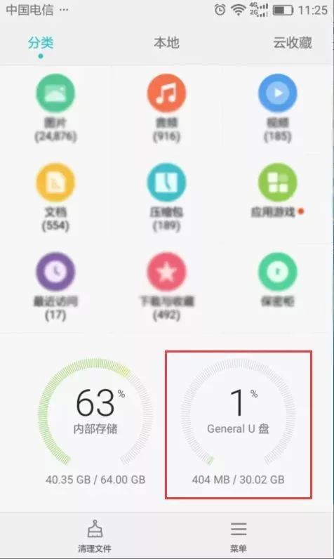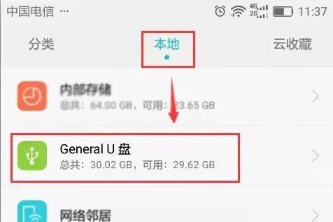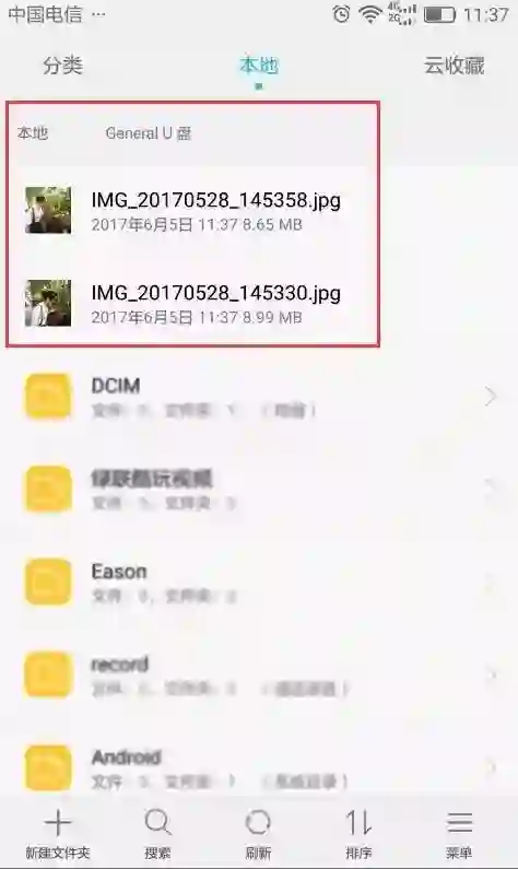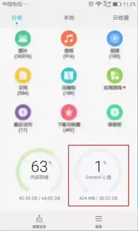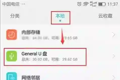 插入手机U盘后,进入手机【文件管理】,一般就可以看到U盘文件夹,这里右边这个【General U盘】就是插入的手机U盘。
