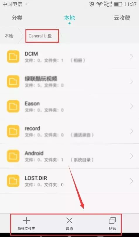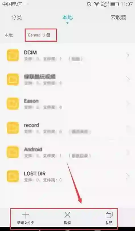 注意,选择了U盘文件夹后,就会进入该文件夹里,手机下方也会出现【新建文件夹】和【粘贴】按钮。