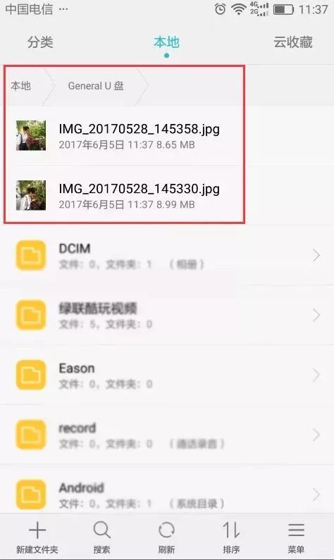 所以可以看到,刚才手机里的那2张图片已经转存到U盘里了。