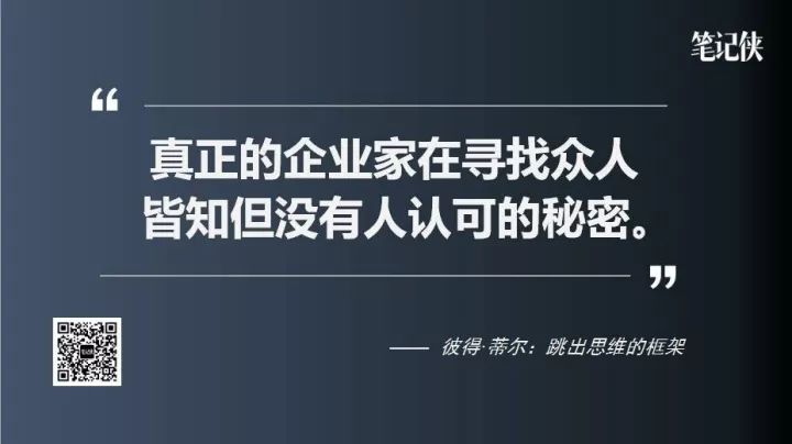 彼得·蒂尔说:“世界上有一些事情是常识。”学校里面的东西基本上都是常识,每个失败者都会很多的常识,真正的企业家在寻找众人皆知但又没有人认可的秘密。