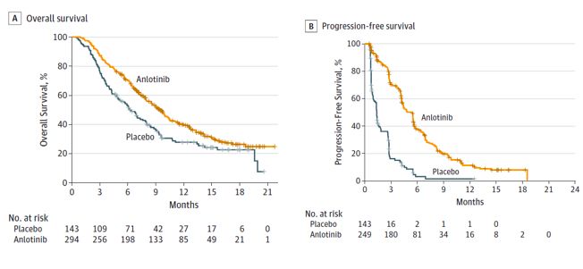 数据截至2017年1月6日,安罗替尼组中位治疗持续时间为18周,安慰剂组仅为6周,两组的中位随访期分别为安罗替尼组8.1个月(范围:0.9-22.1个月)和安慰剂组6.0个月(范围:0.5-21.0个月)。安罗替尼组的6、12、18个月生存率分别为70.6%、40.0%、26.2%优于安慰剂组的52.8%、27.8%、22.7%。