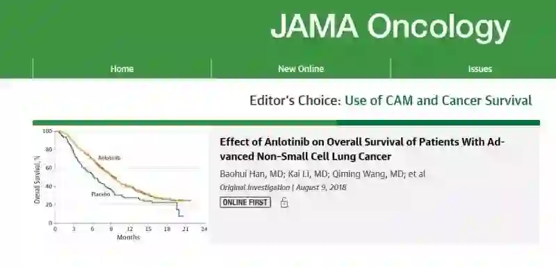 安罗替尼(AL3818)是一种口服的新型小分子多靶点TKI,可强效抑制VEGFR、PDGFR、FGFR和c-Kit等多个靶点,具有抗肿瘤血管生成和抑制肿瘤生长的双重作用。安罗替尼对比安慰剂单药用于晚期NSCLC的三线及三线以上治疗的随机、双盲、多中心的III期临床研究ALTER0303研究结果,今天在《JAMA ONCOLOGY》杂志上正式发表,该研究旨在评估安罗替尼单药用于晚期NSCLC三线及三线以上治疗的疗效和安全性。