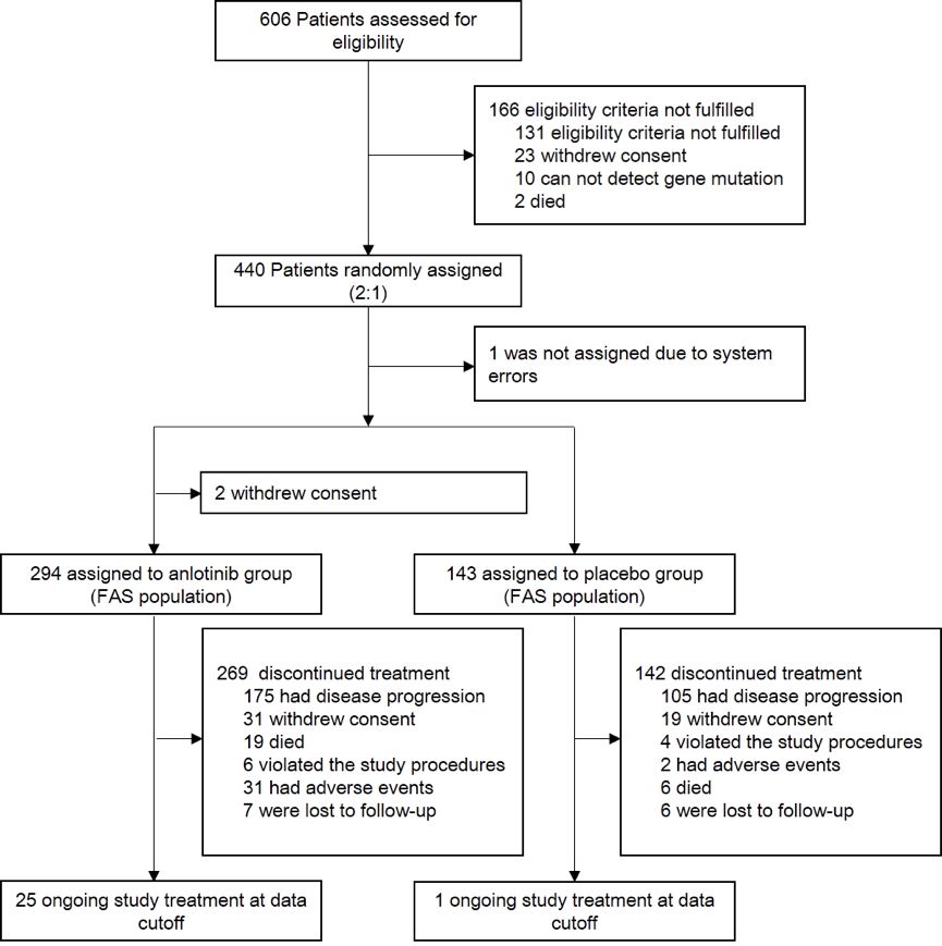从2015年3月至2016年8月,在全国31家中心招募受试者并开展安罗替尼多中心、双盲、随机III期临床研究。受试者按照2:1比例随机分组,预分层因素包括:组织病理学分类(腺癌 vs 鳞癌或其他分型)、转移灶数目(≤3 vs >3)以及驱动基因突变状态(EGFR突变或ALK突变)。入组受试者口服安罗替尼或安慰剂直至进展或出现不可耐受的毒性。安罗替尼的给药方式为口服12mg,每天一次,用两周停一周,21天为一个治疗周期。每2个周期进行一次影像学评估。采用NCI的CTCAE 4.02进行不良事件(AE)分级并对受试者进行安全性评估,如患者无法耐受口服安罗替尼12mg/天,允许调整剂量至8-10mg/天。研究的主要终点为总生存期(OS),次要终点为客观缓解率(ORR)、疾病控制率(DCR)、无进展生存期(PFS)和生活质量评分(QoL)。
