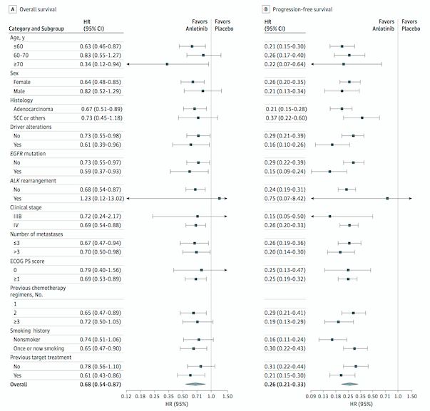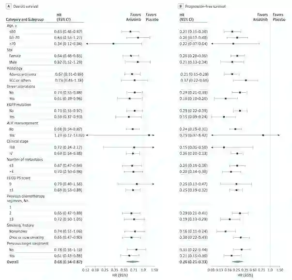 安罗替尼组受试者中位总生存期OS为9.6个月(95% CI 8.2-10.6)相较于安慰剂组的6.3个月(95% CI 5.0-8.1)显著延长了3.3个月,死亡风险降低了32%,研究达到其主要终点。安罗替尼组的中位无进展生存期PFS同样显著优于安慰剂组,分别为5.4个月(95% CI 4.4-5.6)和1.4个月(95% CI 1.1-1.5),详见图二。大部分亚组分析结果显示安罗替尼获益显著优于安慰剂组,详见图三。例如预分层因素中的驱动基因突变状态及病理分型统计分析结果显示,无论受试者是否具有EGFR敏感突变,均可获得PFS和OS的双重获益。经安罗替尼治疗的腺癌受试者具有PFS和OS的双重获益,而鳞癌受试者也具有PFS的显著获益。详尽的亚组分析数据将在未来的文章中陆续发表。