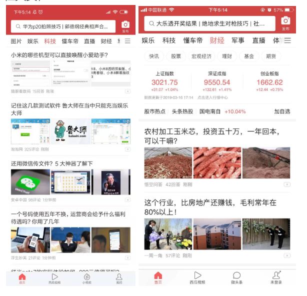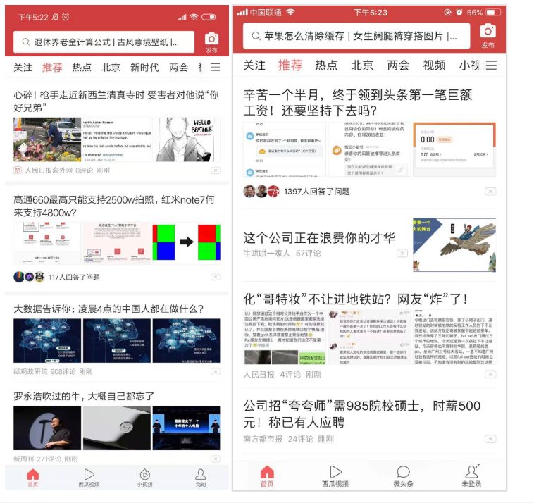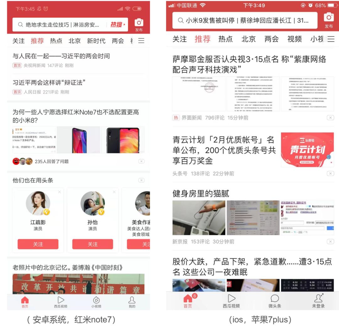 首先,我用两个手机以新用户的身份体验了下头条的个性化推荐(注:分别为Android和iOS系统,且此前未安装过头条)。