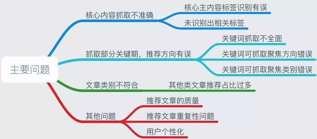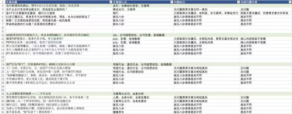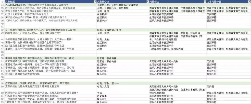 如上图所示,通过抽取数据对50个推荐文章内容数据进行问题标注与问题分类,分为以下几个类别: