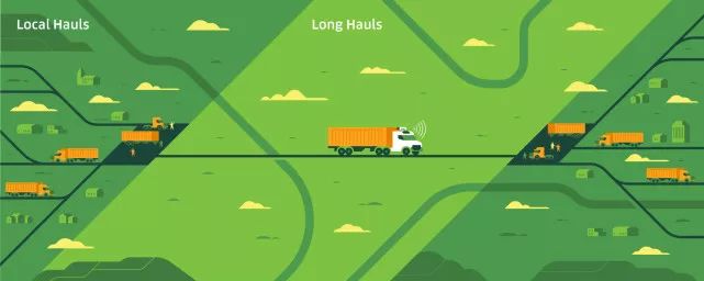 卡车司机将把货物从仓库和工厂运到高速公路附近的转运中心。为高速公路设计的自动驾驶卡车将会接收这些货物,将其送往另一个转运中心。最终,人工司机将负责把货物送到目的地。