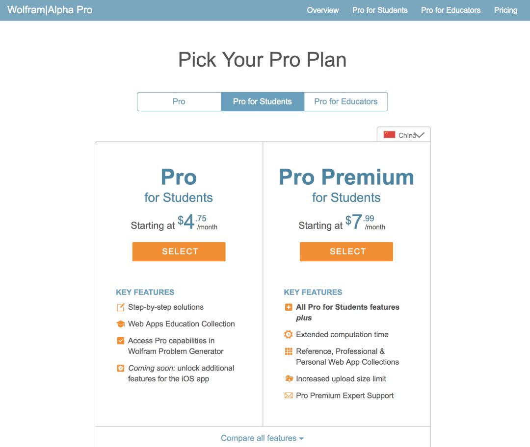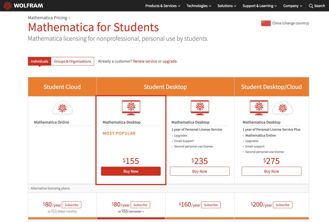 如果你是高中及以上的在校学生,可以点击访问 Mathematica 学生优惠页面,选择你需要的套餐。如果没有特殊需求的话,最低档次的 Mathematica Desktop 应该已经足够使用。