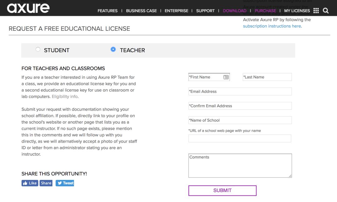 如果你是教育工作者,但想在教学以外的领域使用 Axure RP,也可以发送邮件至 sales@axure.com 申请,通过审核后便可以获得六折优惠。