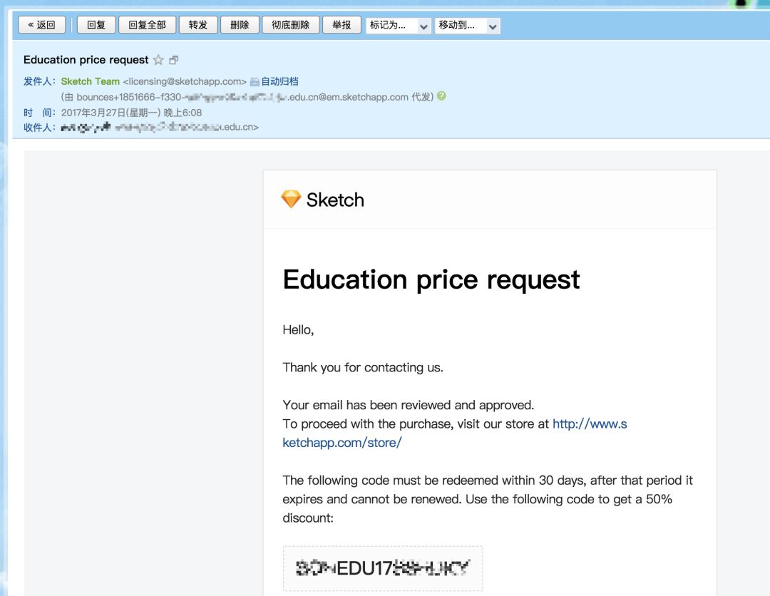 提交表单后,Sketch 团队便会着手进行资质审核,并在通过后为你发来一张专属 5 折优惠券。随后,你只需要访问 Sketch Store,按照正常流程下单,并在结账时输入优惠码便可以了。除了外币信用卡外,Sketch 也支持使用支付宝进行支付,让你无后顾之忧。