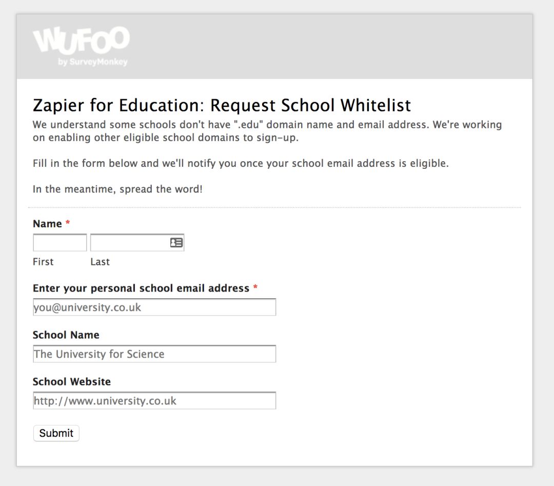 好吧,我知道上面的限制直接筛掉了绝大部分使用 .edu.cn 域名的国内高校,不过不用灰心,因为你可以访问 该页面,填写表单,提交你就读学校的官网地址。通过审核后,Zapier 官方就会将你和你所在学校的域名添加至白名单,并通过邮件告知你。