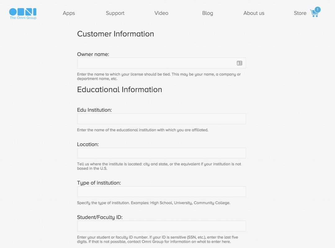 只需要点击访问 Omni Education Store,将你想购买的软件加入购物车并结算,你就会被跳转至身份验证页面。在这里,你需要提供包括学校名称、位置、官网、学生证号码等在内的各项证明信息,点击继续后等待验证通过就可以付款了。