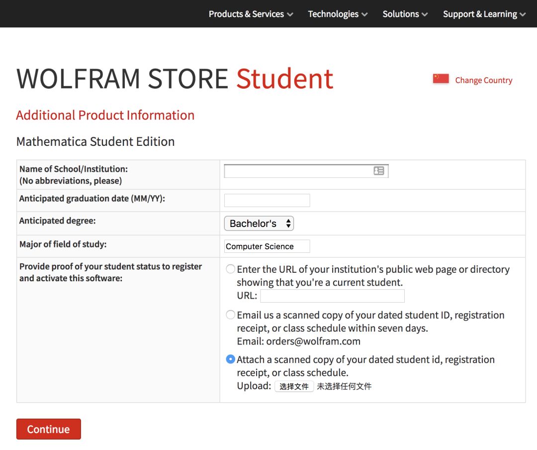 选择好平台和语言,点击 Add to Chart 按钮,网页会要求你提供相关的学生身份证明。如果你所就读学校的官网页面上可以查询到你的姓名和专业等信息,可以直接输入 URL 验证。此外,你也可以提交自己的学生证扫描文档,上面需要包含与表单上所填信息相同的学校、专业、预计毕业日期等注册信息。
