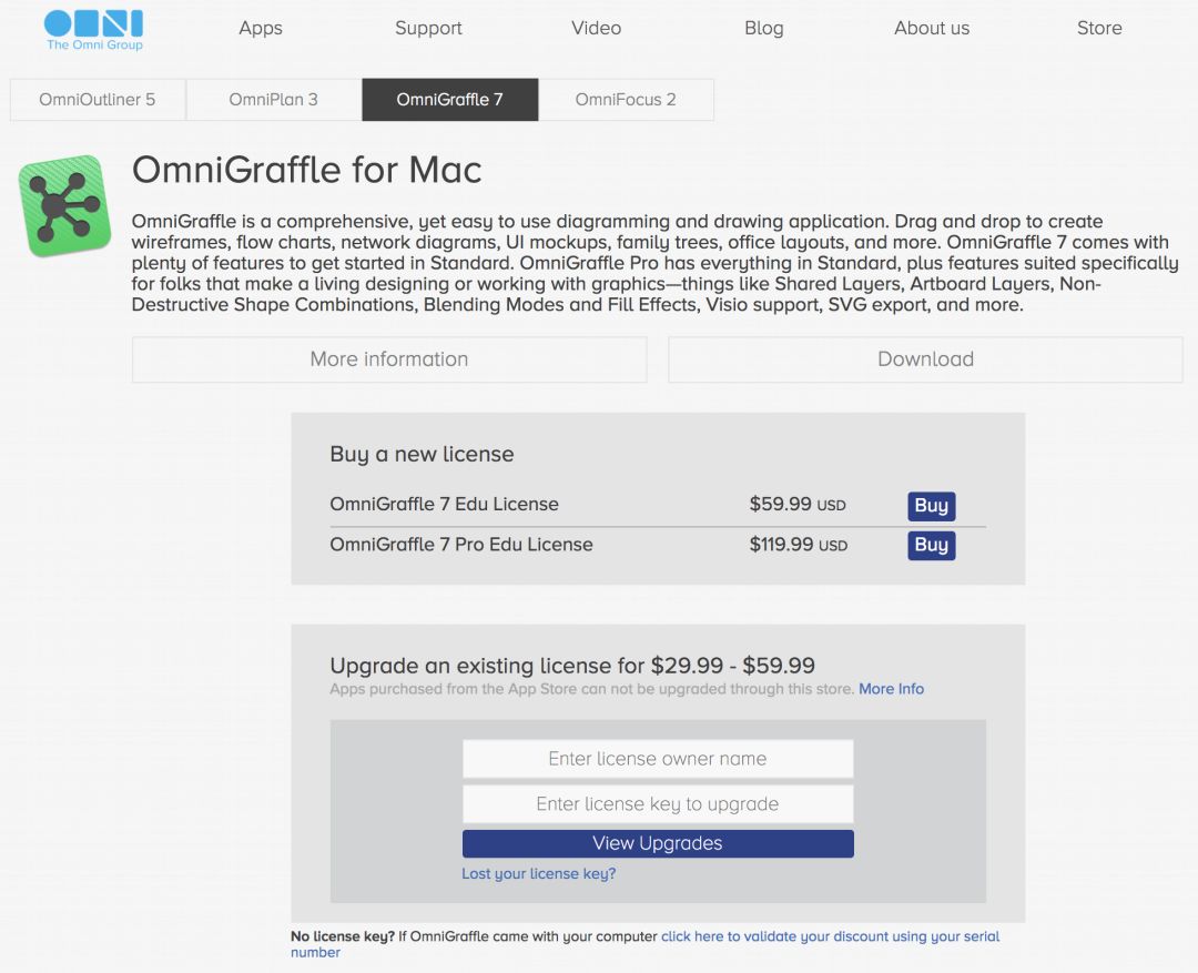 针对在校学生和教育工作者,Omni Group 提供了低至 6 折的优惠价格,以 OmniGraffle 为例,原价 199.99 美元的专业版授权只需要 119.99 美元就能拿下,相当划算。