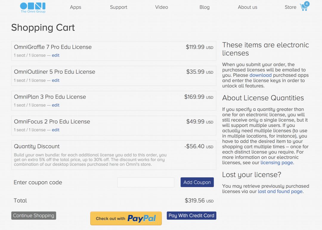 除了学生的 6 折优惠外,每多购买一份 Omni Group 旗下软件,你就可以额外享受 5% 优惠,最高可以再优惠 30%。如果你将 Omni 全家桶都收入囊中,就可以整整少花 56.4 美元,可以说是相当划算了。