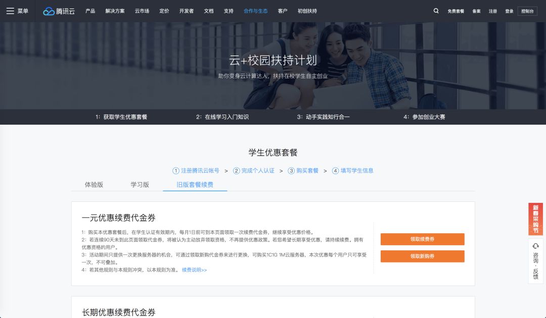 购买成功后,你可以点击前往腾讯云 云+校园活动页面,点击续费按钮,输入姓名、身份证号、就读学校等信息进行学生认证,通过后就可以以每年 120 元的价格续费两次,总计可以获得 40 个月的云服务器时长。