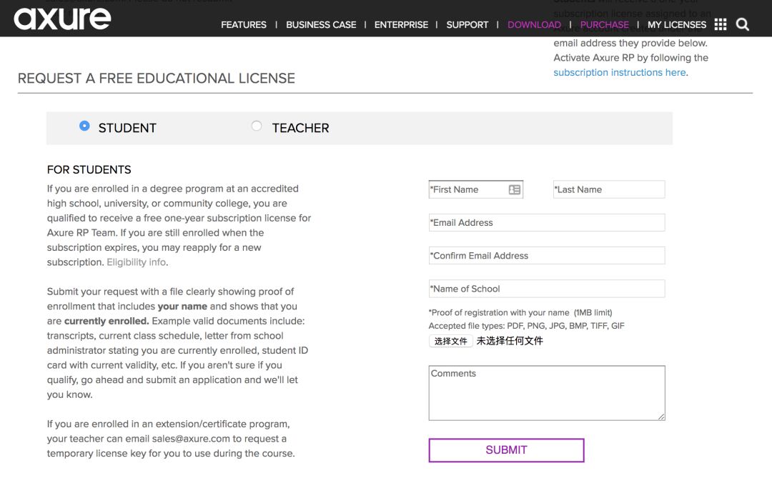 如果你是学生,可以点击访问 Axure 学术计划申请页面,按提示填写你的姓名、电子邮箱地址、学校名称等信息,并上传自己学生证的扫描照片或 PDF 文档,再耐心等待 Axure 团队审核结果就可以了。