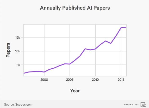 具体而言,自1996年以来,计算机科学一般领域的论文数量增长了6倍,同期,每年的人工智能论文数量增长了9倍以上。