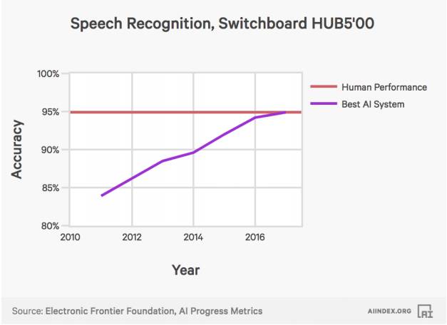 在2017年,微软和IBM都在Switchboard语音识别基准测试中实现了“人类同等水平”的语音识别词错率。