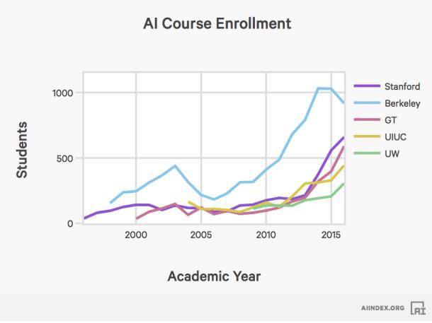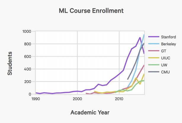 斯坦福大学入学选修人工智能和机器学习入门课程的学生人数,自从1996年以来增长了11倍以上。报告指出,由于其他大学的数据掌握有限,因此突出了斯坦福的数据。