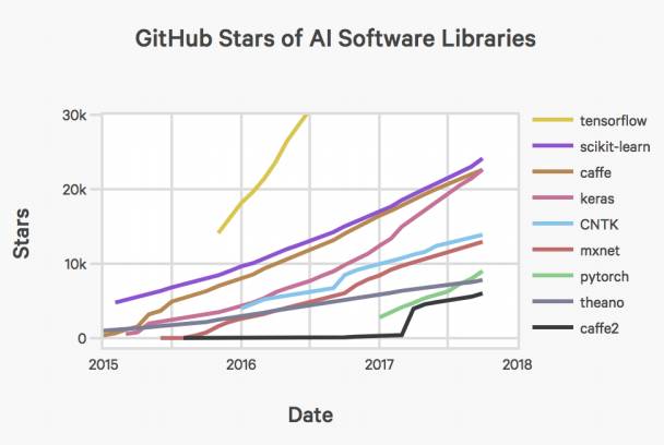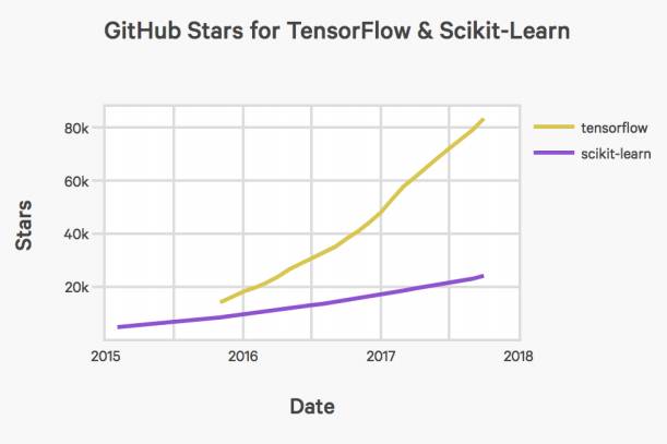 最后看开源软件使用和生态。下图展示了TensorFlow和Scikit-Learn软件包在GitHub上加星标的次数。