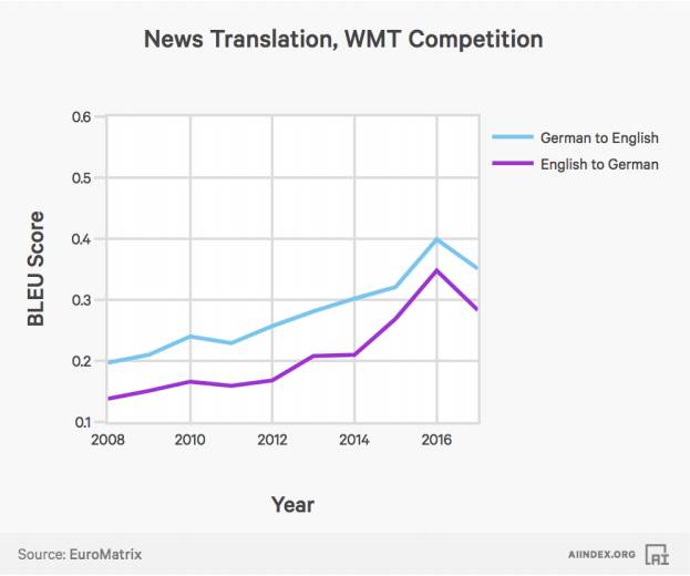 人工智能系统在翻译英文和德文的任务上的表现。
