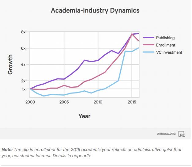 数据显示,最初,学术活动(论文发表和招生)驱动稳步前进。 2010年前后,投资者开始注意到这一趋势,这成为2013年投资者总体活动急剧增加的驱动因素。再后来,学术界逐渐赶上了工业的繁荣。