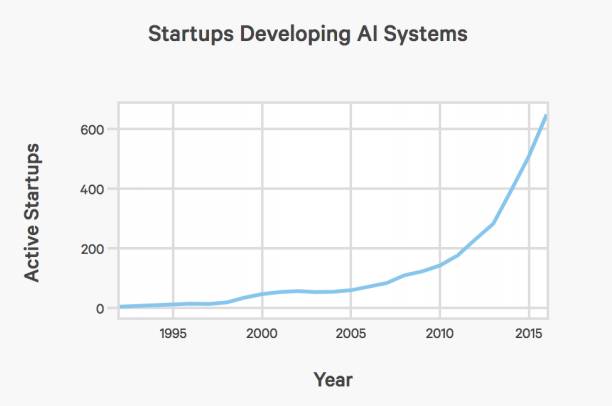 现在将目光转向产业界。下图展示了在美国,有资本支持的AI创业公司数量,从2000年以来增加了14倍: