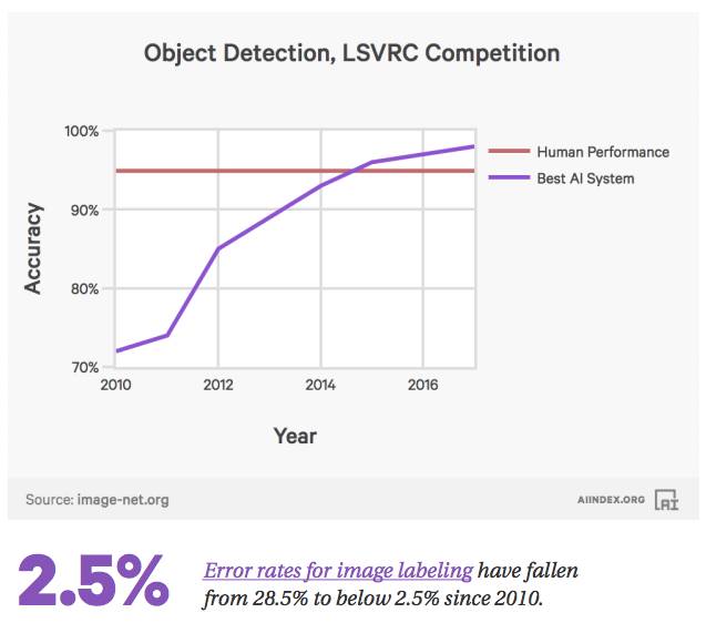 2016年,ImageNet自动标注任务的错误率从2010年的28%下降到低于3%。人类的表现大约是5%的错误率。