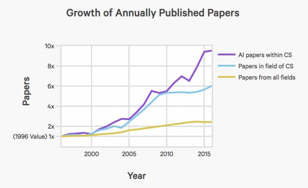 首先,论文发表数量激增:自从1996年以来,每年发表的AI论文数量增加了9倍以上。