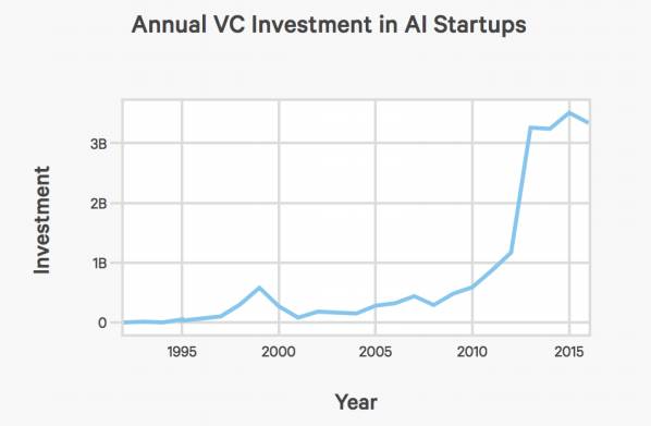 在美国投资AI创业的基金数量也在增长,从2000年以来,每年投入AI创业的资本额增加了6倍: