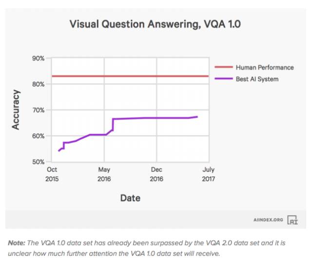 人工智能系统在完成回答有关图像的开放式问题任务上的表现。截止2017年8月,最好的AI系统准确率还不到70%,而人类水平在85%左右。