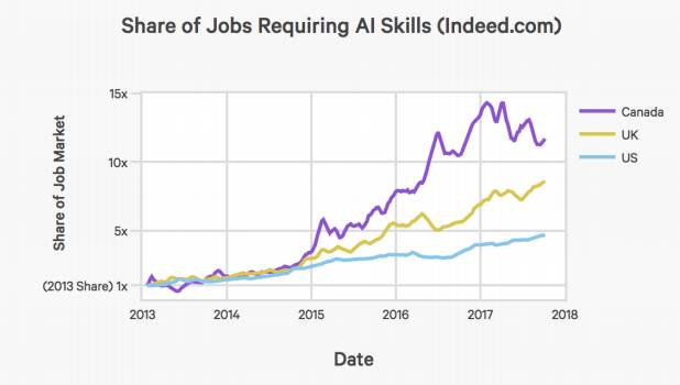 根据两个在线求职平台Indeed和Monster的数据,人工智能相关岗位需求也在增长。下图展示了Indeed.com平台上,从2013年1月份起,对AI技术相关工作岗位的份额的增长。