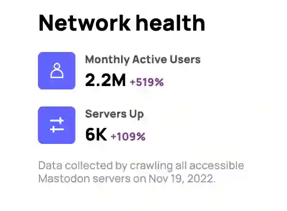 4、根据 Mastodon(中文译名长毛象)官网 11 月 19 日统计数据,类 Twitter 内容社区平台 Mastodon 月活跃用增长 519%,MAU 达到 222 万,百万 Twitter 用户涌入长毛象。