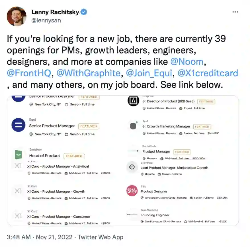 根据前 Airbnb 产品负责人 Lenny Rachitsky 在 Twitter 上发布“如果你正在找工作可以看看 Noom、Front、WithGraphite、Join_Equi、X1creditcard 等公司。