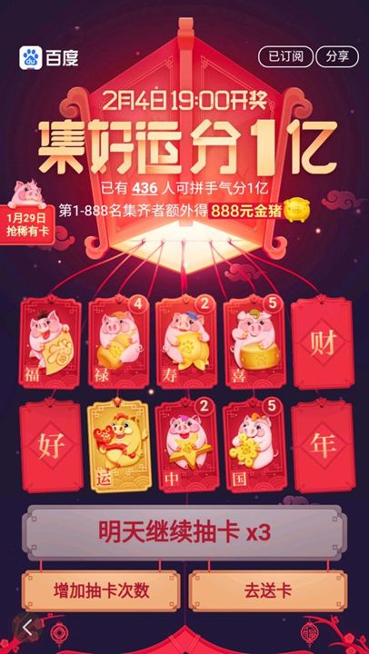 前期的预热活动基本上和支付宝的集五福活动很像,集齐 10 张好运卡片瓜分 1 亿元。