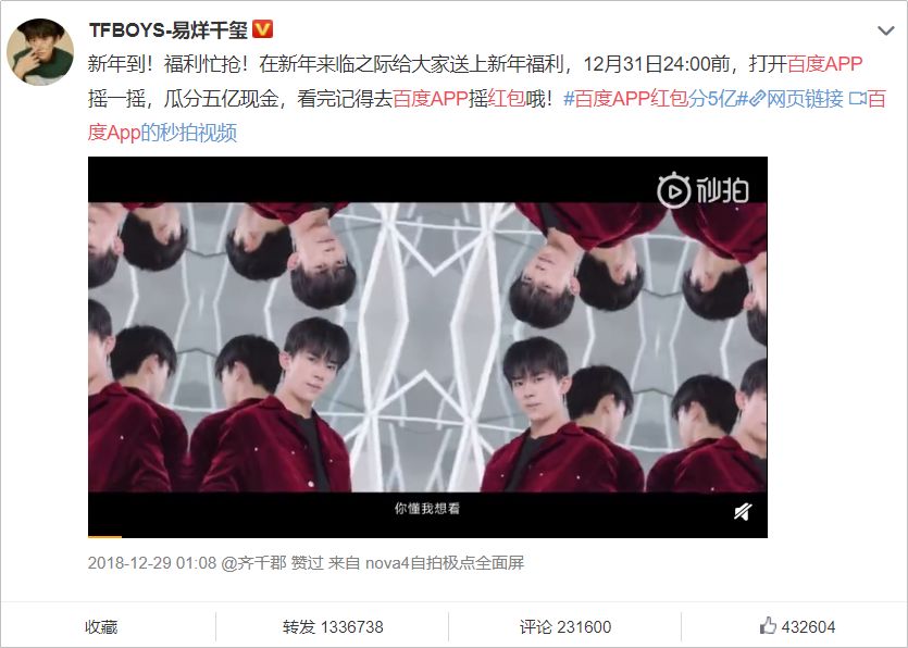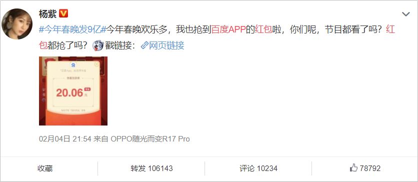 除夕当晚,除了在央视春晚直播期间不间断广告,更是邀请了易烊千玺,杨紫等明星为活动代言,并在活动期间晒出抢到的红包金额。