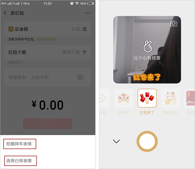 除了企业定制红包之外,当数拜年的表情红包最有趣了,因为今年的发红包玩法升级,可以在红包上加表情,加的表情可以是图片表情,还可以自拍表情。
