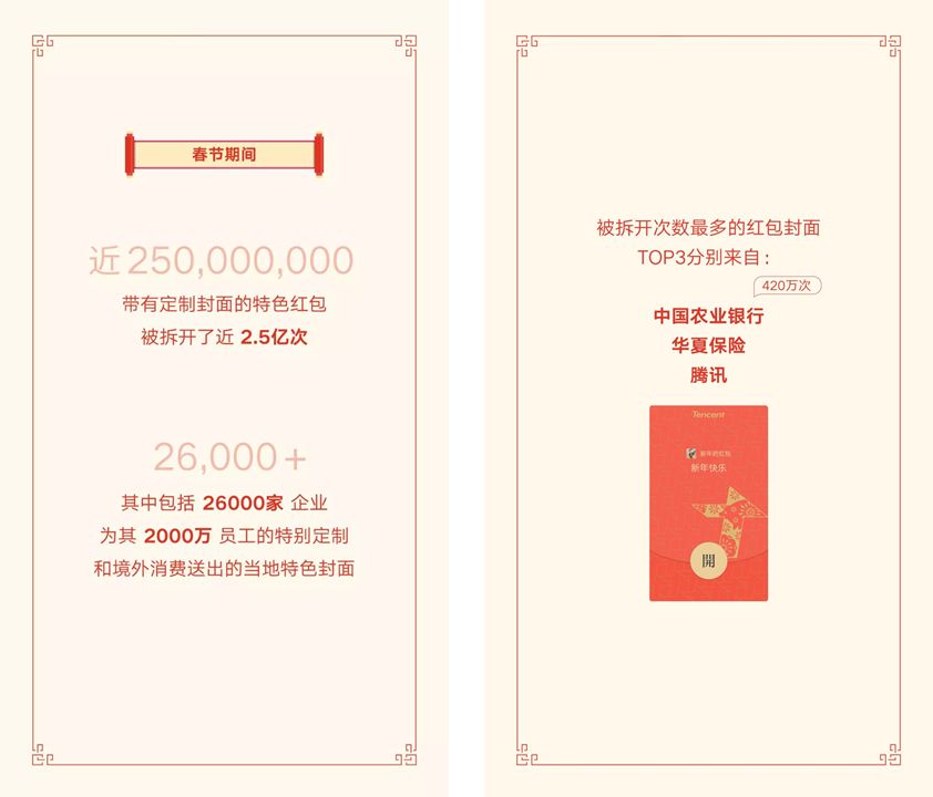比如早在春节之前的企业定制红包封面,有微信认证的企业即可定制红包封面。根据微信官方的报告显示,有 26000 家企业为其 2000 万员工特别定制和境外消费送出的当地特色封面。