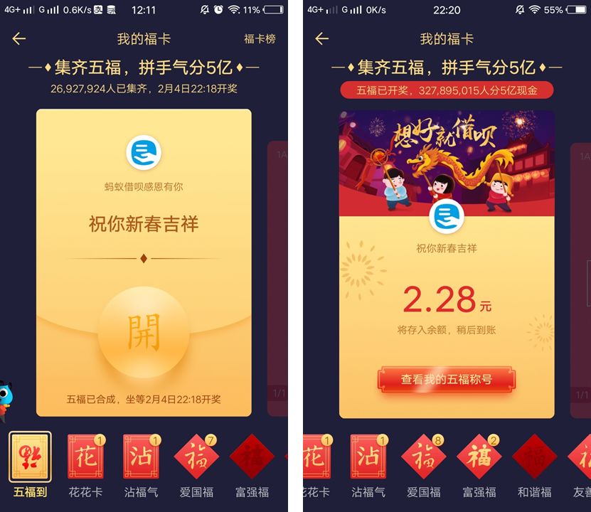 今年已经是支付宝集春节五福的第 4 年,基本的玩法还同以往一样,但竞争却更加激烈。活动从 1 月 25 日开启,不到半小时已有超 2 万人集齐。