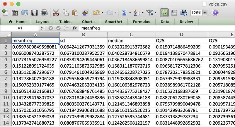 那么你如何从音频里识别语音?如果你下载了该数据集并查看 voice.csv 文件,你将只会看到一行又一行的数字: