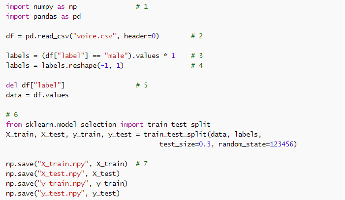 使用 pandas 将数据集从 voice.csv 加载到所谓的 dataframe 中。此对象的工作原理非常像电子表格或 SQL 表。