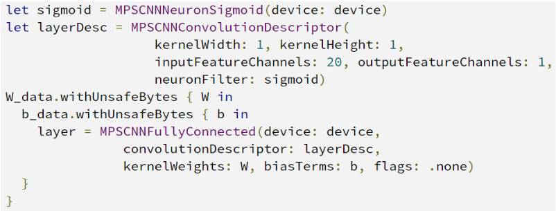 注:对于我们简单的分类器,W 是一个 20 x 1 的矩阵,它仅包括了 20 个浮点数。对于更加复杂的模型,你模型的参数可能会是一个 4D 的张量。这种情况下,你将不得不对其中的一些维度做变换,因为 TensorFlow 中的数据存储形式与 Metal 的数据存储形式不一样。这可以通过简单的 tf.transpose() 命令来实现,但是这对于我们的分类器而言是不需要的。
