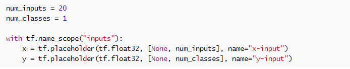 首先,我们定义输入数据张量 x,该张量的形状为 {1,20},即 1 个样例,20 个特征。然后将我们的数据从数组转换成 TensorFlow 中的张量。