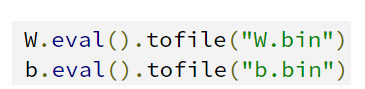 W.eval() 用于计算当前的 W 值,并以 NumPy 数组返回(这与 sess.run(W) 所做的事情一样)。然后,我们使用 tofile() 将 Numpy 数组保存为二进制文件,这就是我们需要做的事情。