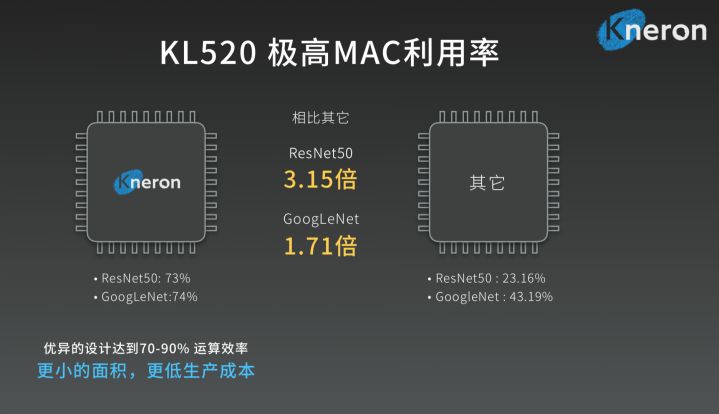 KL520 算力峰值为0.39TOPS (300MHz) 。相比主流AI芯片的理论算力峰值 1-2TOPS,KL520 看起来并不占优势。不过由于核心利用率(MAC利用率)达到竞品的2-3倍,使其实际效果达到与1TOPS的相近水平,同时保持极低的功耗和成本。