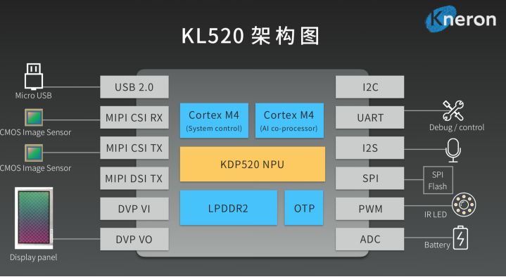 作为一颗SoC级芯片,KL520采用常规的ARM核+自研IP架构,双核ARM M4 CPU+KDP 520NPU,其中KDP 520NPU为耐能自研IP,两核的ARM M4用于系统控制和协处理。采用SDRAM 32MB/64MB 系统级封装,LPDDR2内存技术,可接外部64MB闪存。