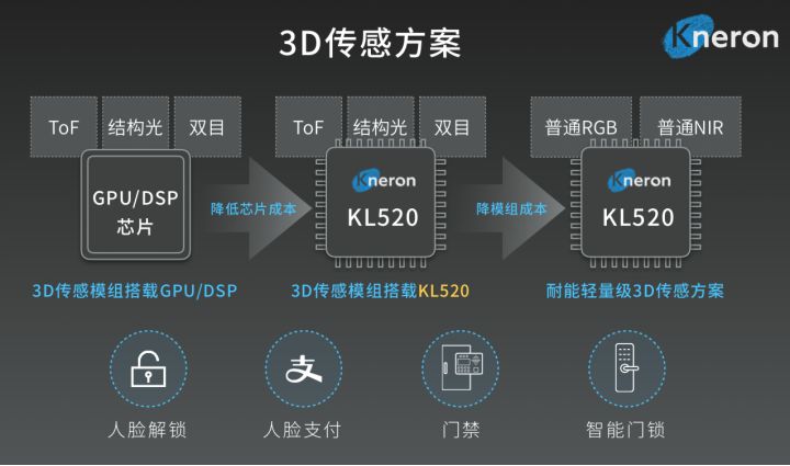 为应对3D摄像头模组贵、芯片成本高、硬件功耗高等3D传感行业痛点,耐能通过和奇景光电、高通合作推出轻量级3D传感方案,将传统的3D传感模组ToF/结构光/双目+GPU/DSP芯片方案简化为,普通RGB摄像头+普通NIR(近红外光)+KL520,在芯片和模组两个层面降低成本。