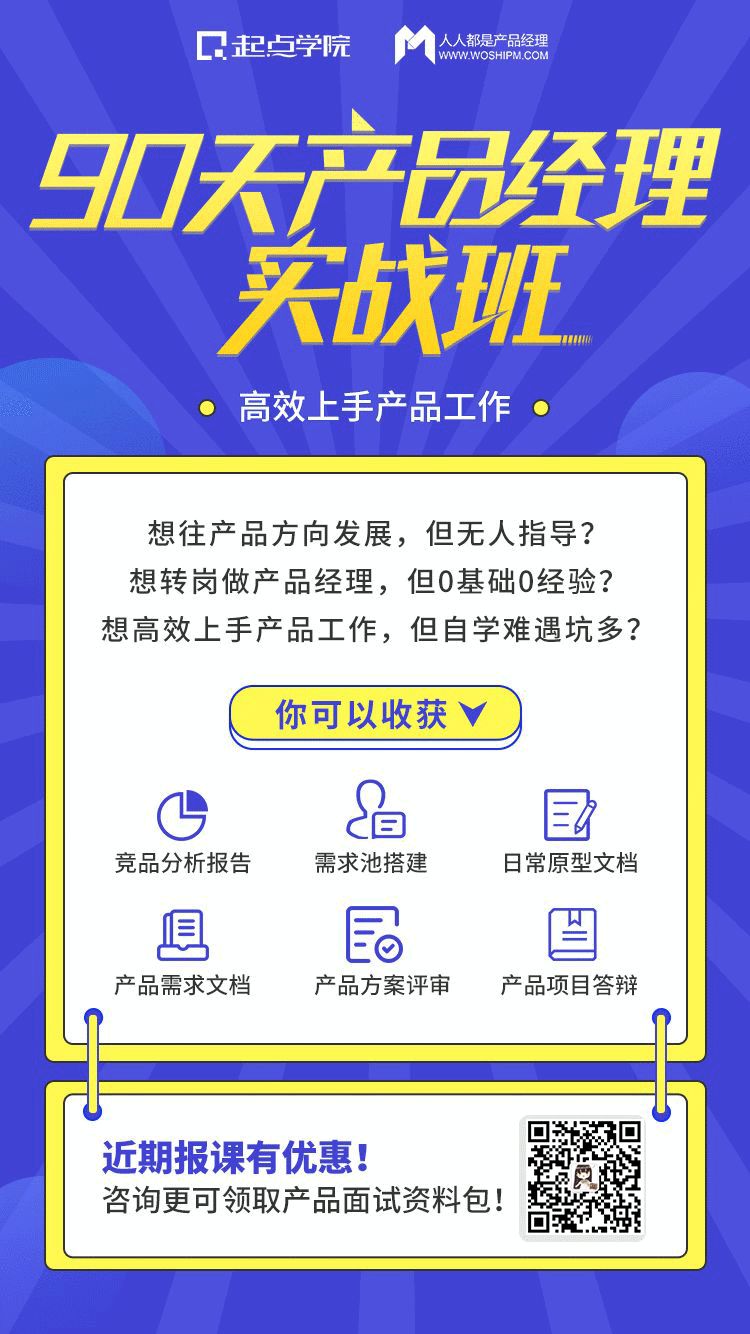 这里向大家推荐起点学院联合腾讯课堂创办的产品初阶课程「90天产品经理实战班」。一线大厂导师带你系统学习产品知识核心板块,从0到1体验产品实战的全流程,达到产品岗位的用人要求,提升自我核心竞争力!