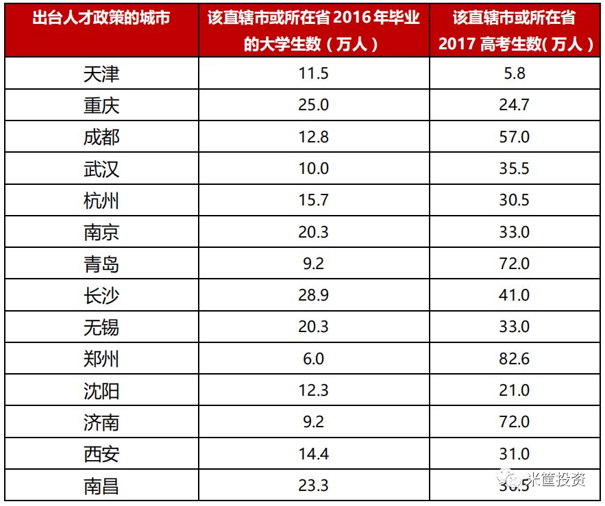 因此,在已出台人才政策的城市中,重庆、成都、杭州、南京、长沙等城市在参加高考学生数、毕业大学生数两个方面均表现突出,后期在人力资源的储备上也将更加具有优势。